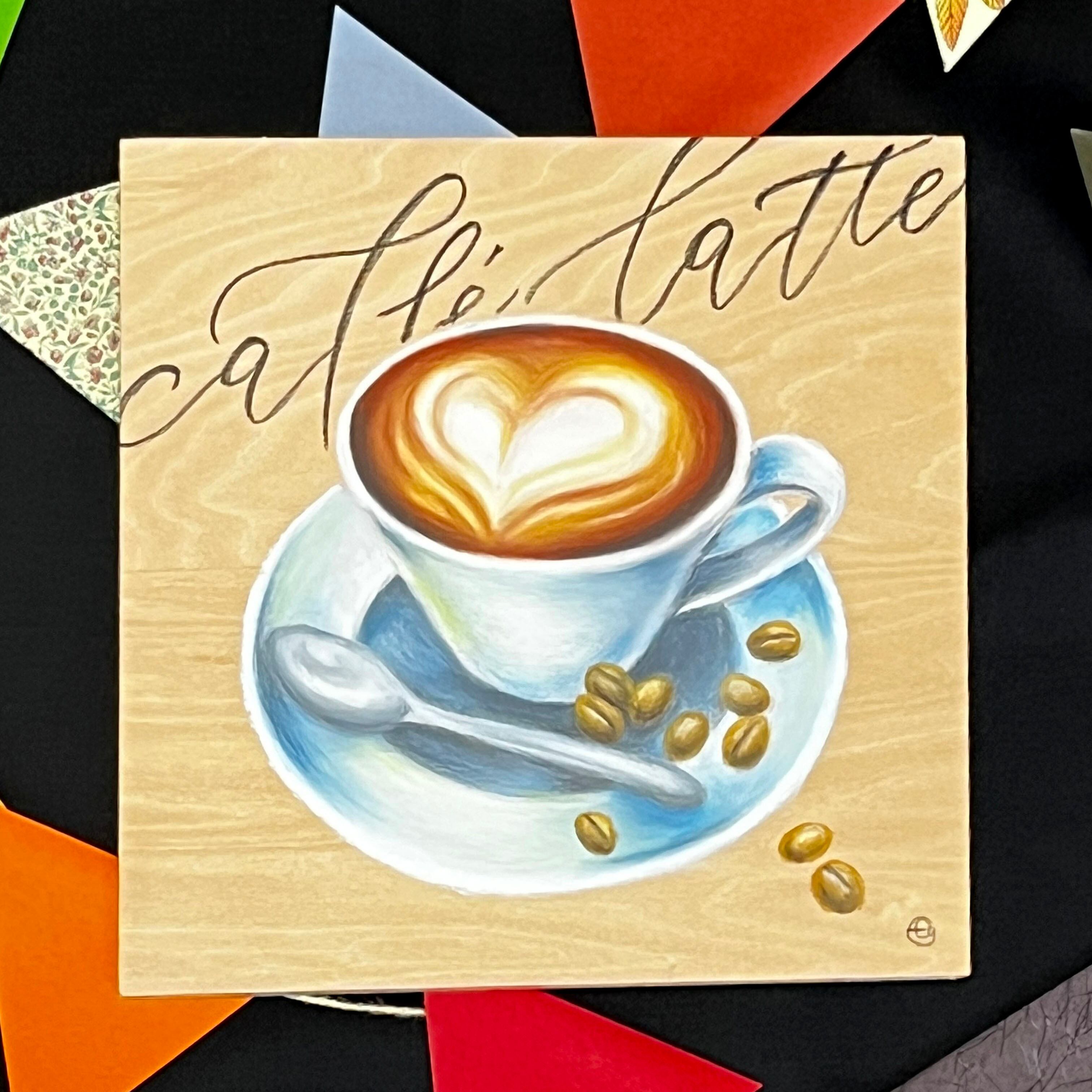 コーヒーカップをモチーフにしたこちらの作品は、見る人に心地よい癒しを与えてくれます。